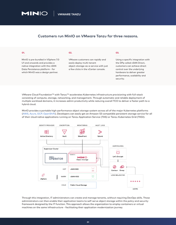 using Kubernetes. VMware Tanzu users can quickly and easily deploy multi-tenant MinIO object storage within